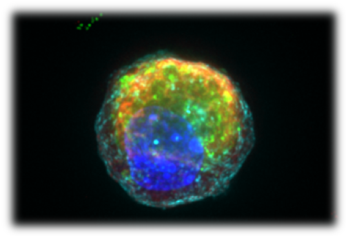 *Photo: Image of a single Paneth cell with anti-microbial granules in red and green, derived from and adult intestinal stem cell, following the small molecule bioengineering approach identified by Mead et al.