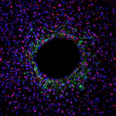 Photo: MiNDS probes cause minimal injury to brain tissue. This picture shows minimal tissue scarring (green and red stains) and healthy neuron growth (purple) surrounding the implant. Credit: Khalil Ramadi